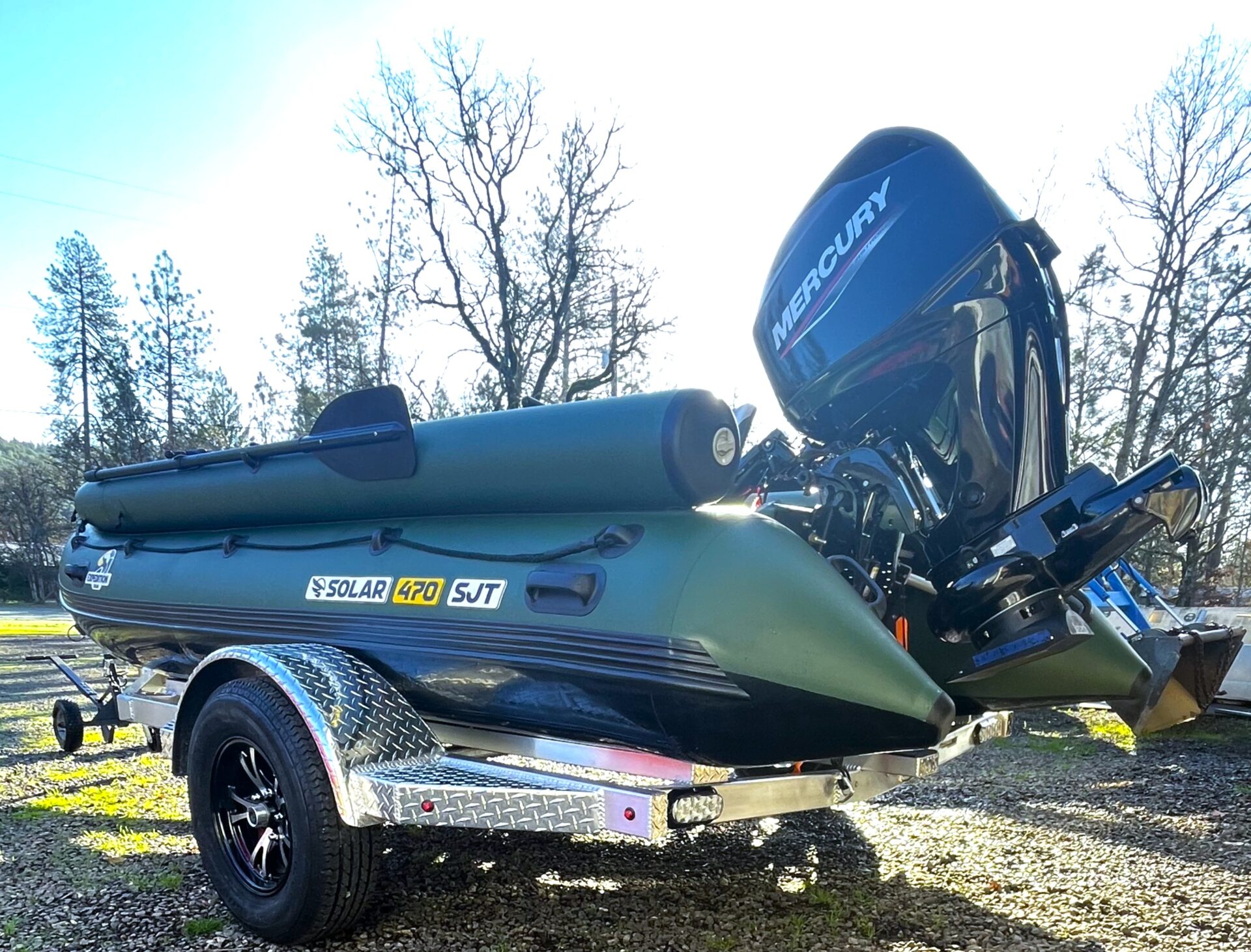 Jetech Package: Solar 470 Superjet Expedition (Green) with American Made custom aluminum trailer, Mercury 40jet, and a custom frame/seating package. $33,765.00